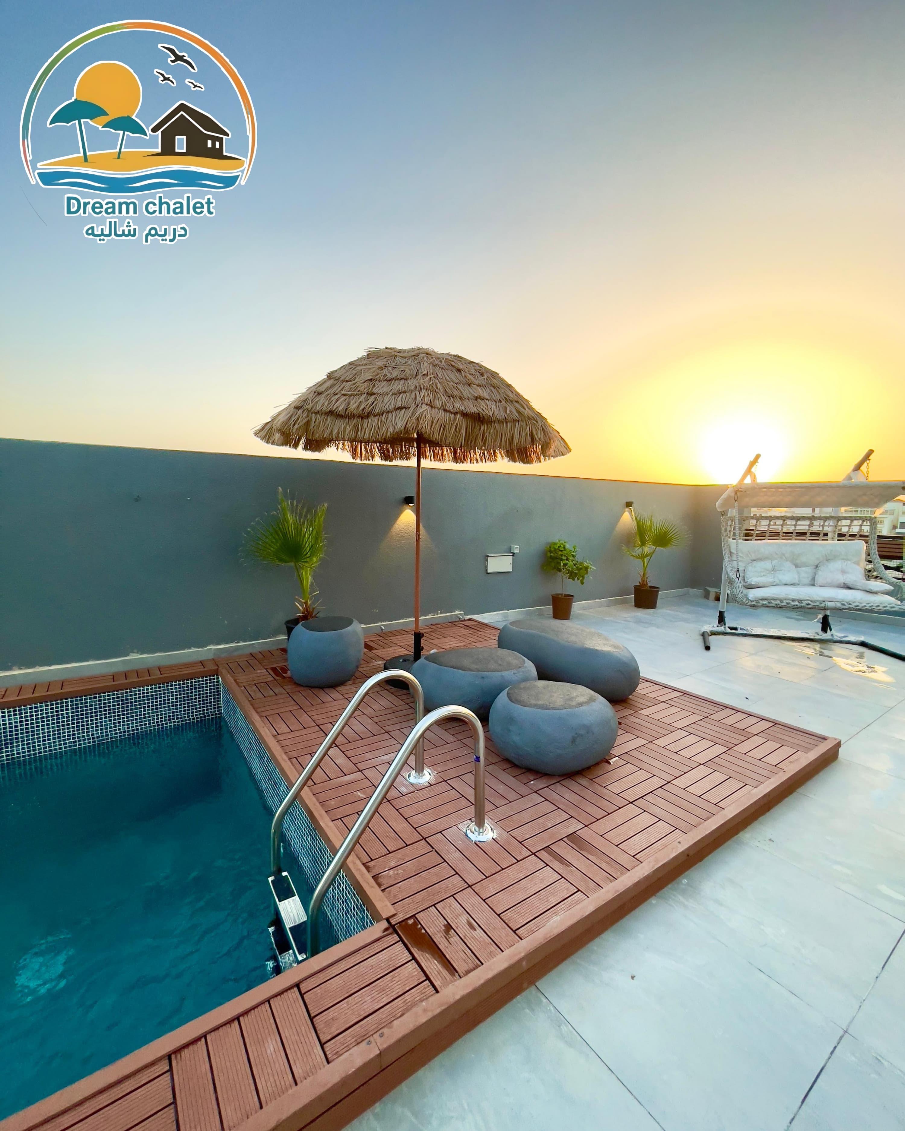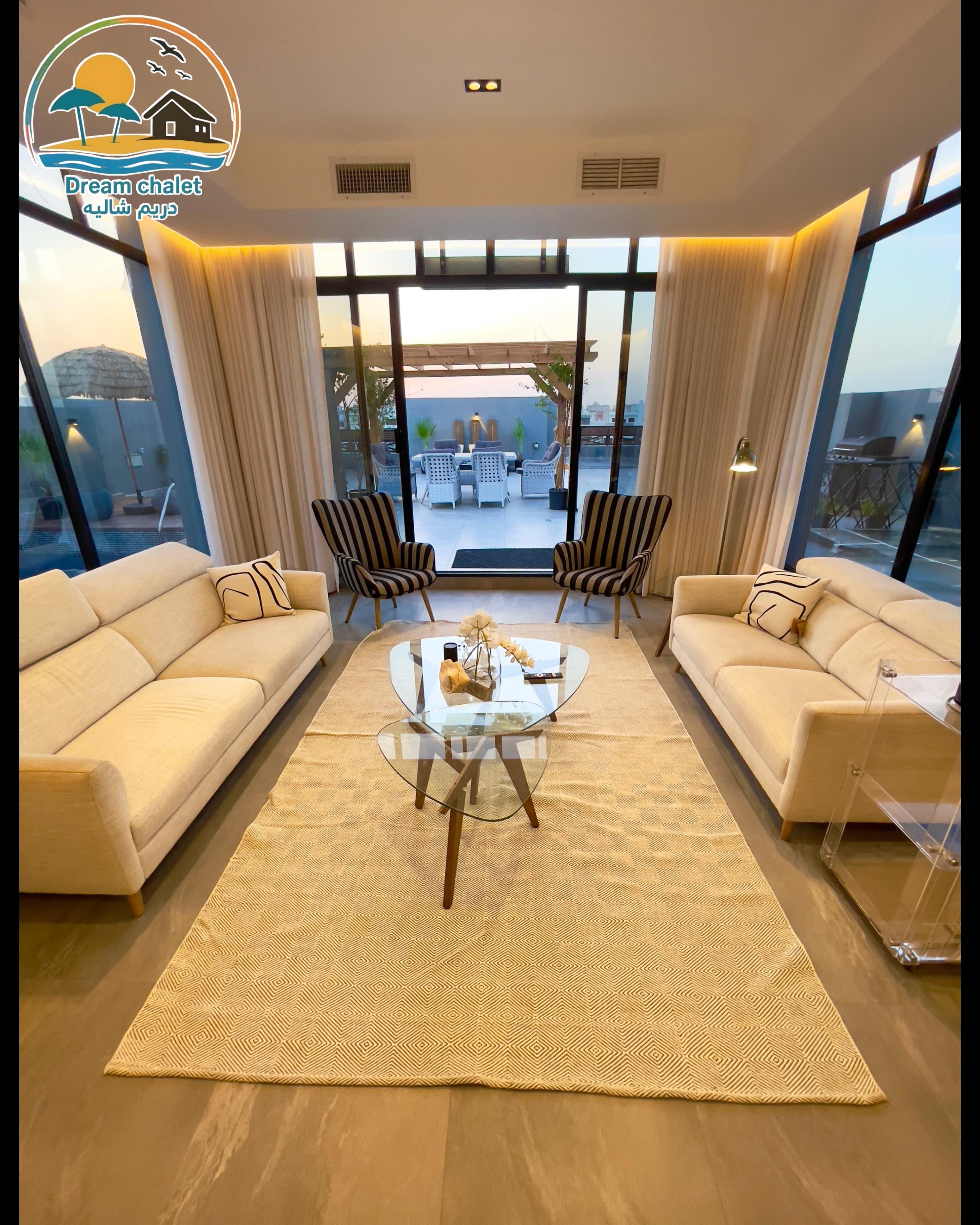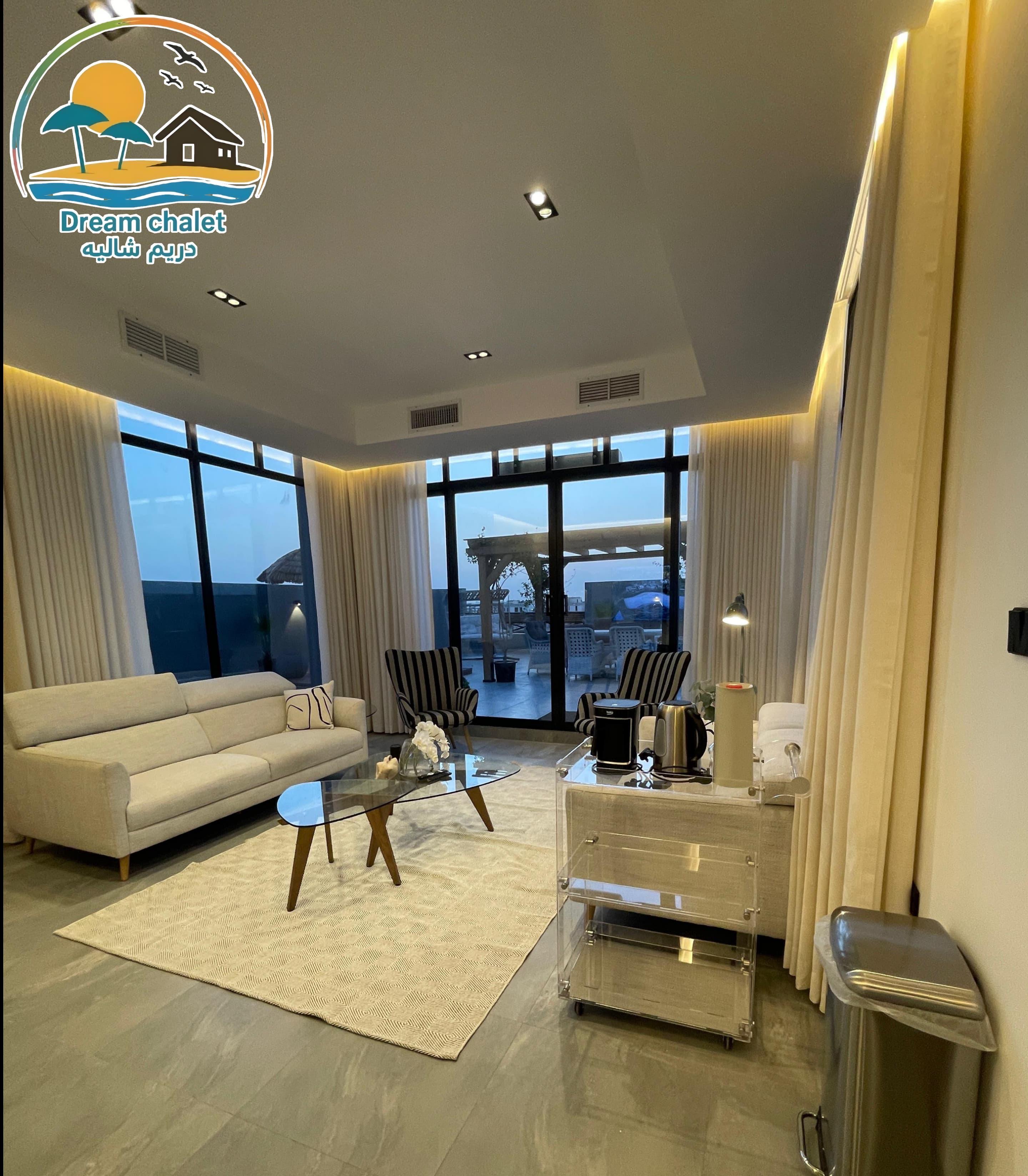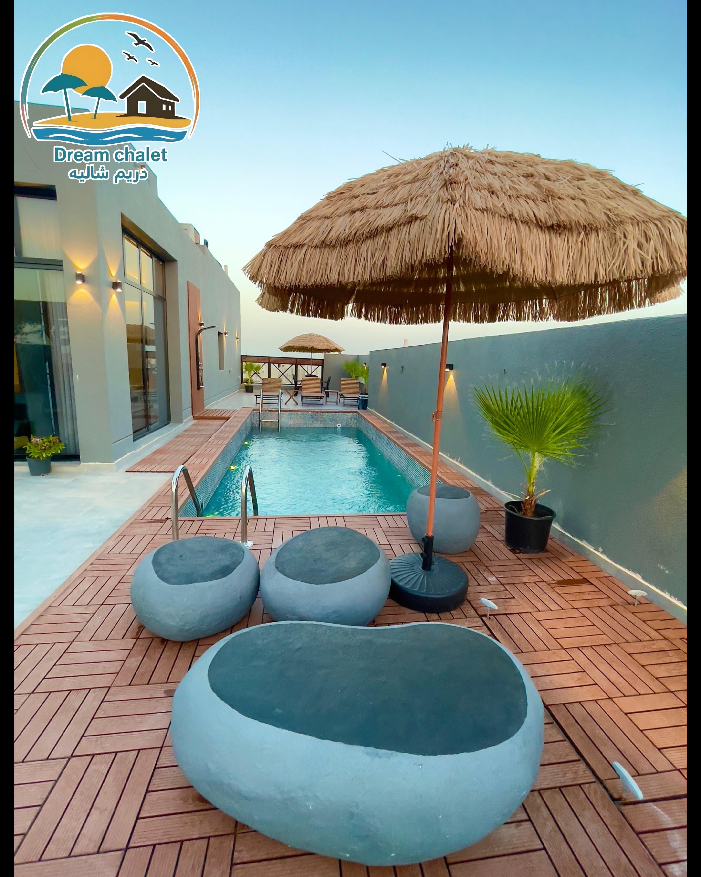 الشاليه عباره عن غرفة ماستر وصاله وحمام سباحه وجلسات خارجيه